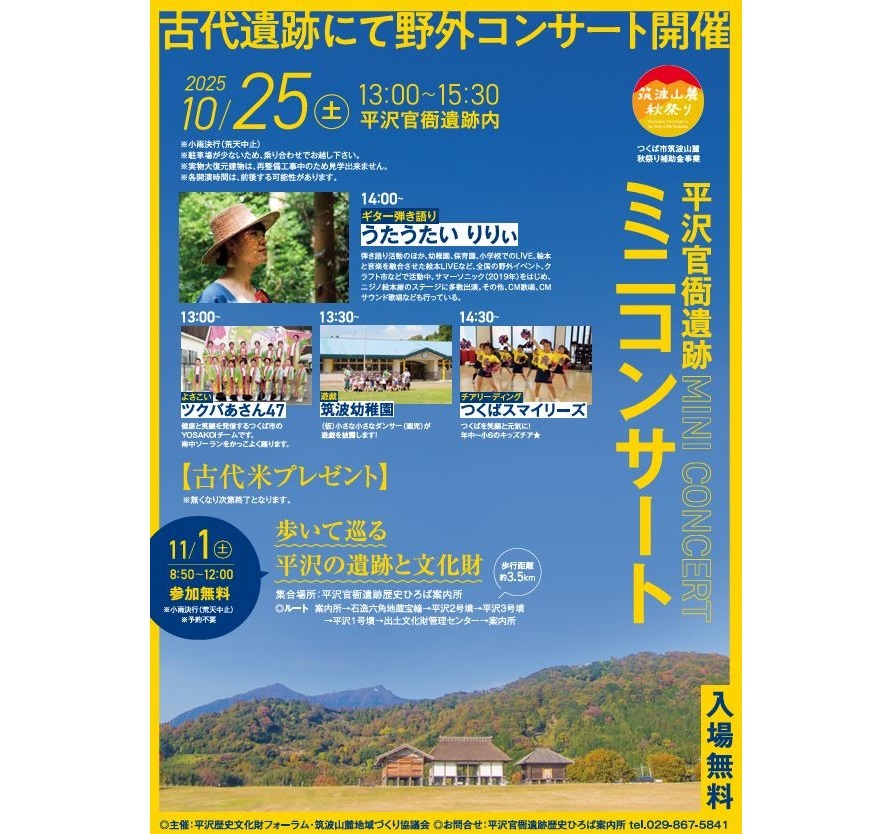 の【雨天により中止】平沢官衙 秋のミニコンサート <鑑賞>Concert at HIRASAWA government ruins2025.10.25 土 13:00~15:30【10.25 雨天により中止となりました】平沢官衙の復元建物をバックに野外コンサート。雨天中止 (無料)主催/NPO法人平沢歴史文化財フォーラム歩いて巡る平沢の遺跡と文化財 <鑑賞>A walk around the ruins and cultural properties of Hirazawa2025.11.1 土 9:00~12:00平沢官衙案内所8:50集合(予約不要・雨天決行)。コース:案内所、 石造六地蔵宝幢、平沢2号墳、平沢3号墳、平沢1号墳、出土文化財管理センター。 (無料)主催/NPO法人平沢歴史文化財フォーラム