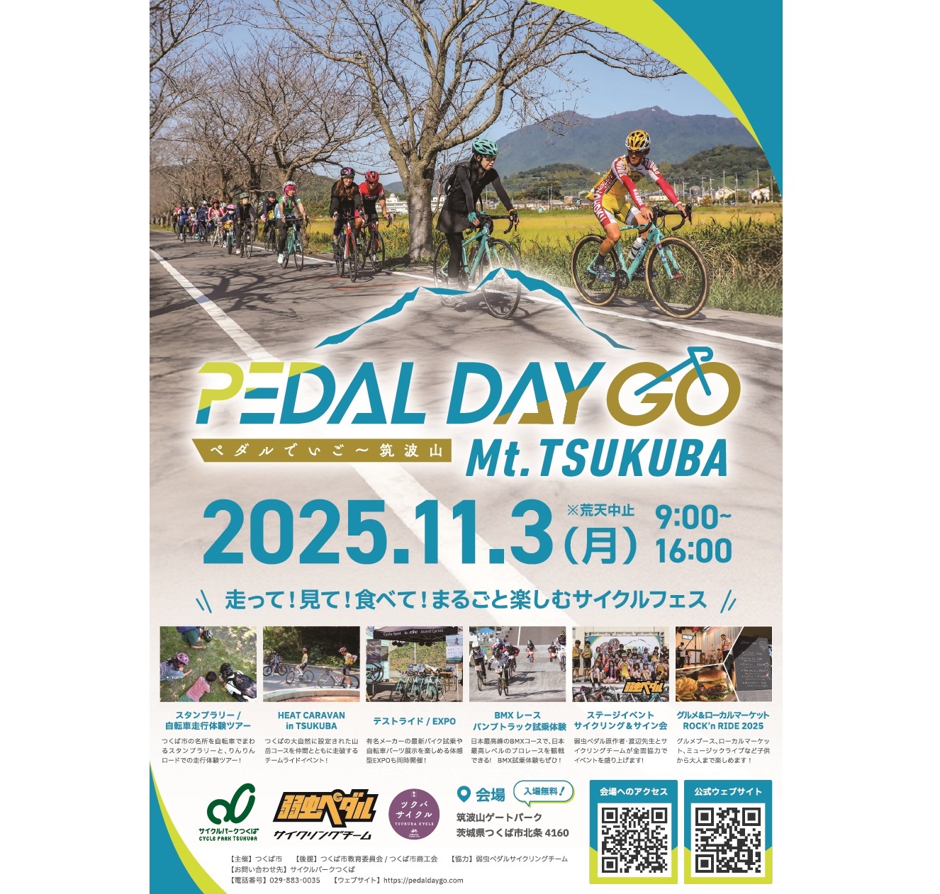 ねPEDAL DAY GO Mt.TSUKUBA <食・体験・鑑賞>Bicycle Event2025.11.3 月 9:00~16:00走って!見て!食べて!まるごと楽しむサイクルフェス 入場無料!小学生以下は無料でもらえる特製ノベルティあり! サイクルスタンプラリー、チームライド、BMXレーシングシリーズ、弱虫ペダルとのコラボレーションなど https://pedaldaygo.com/ (入場無料)主催/サイクルパークつくば