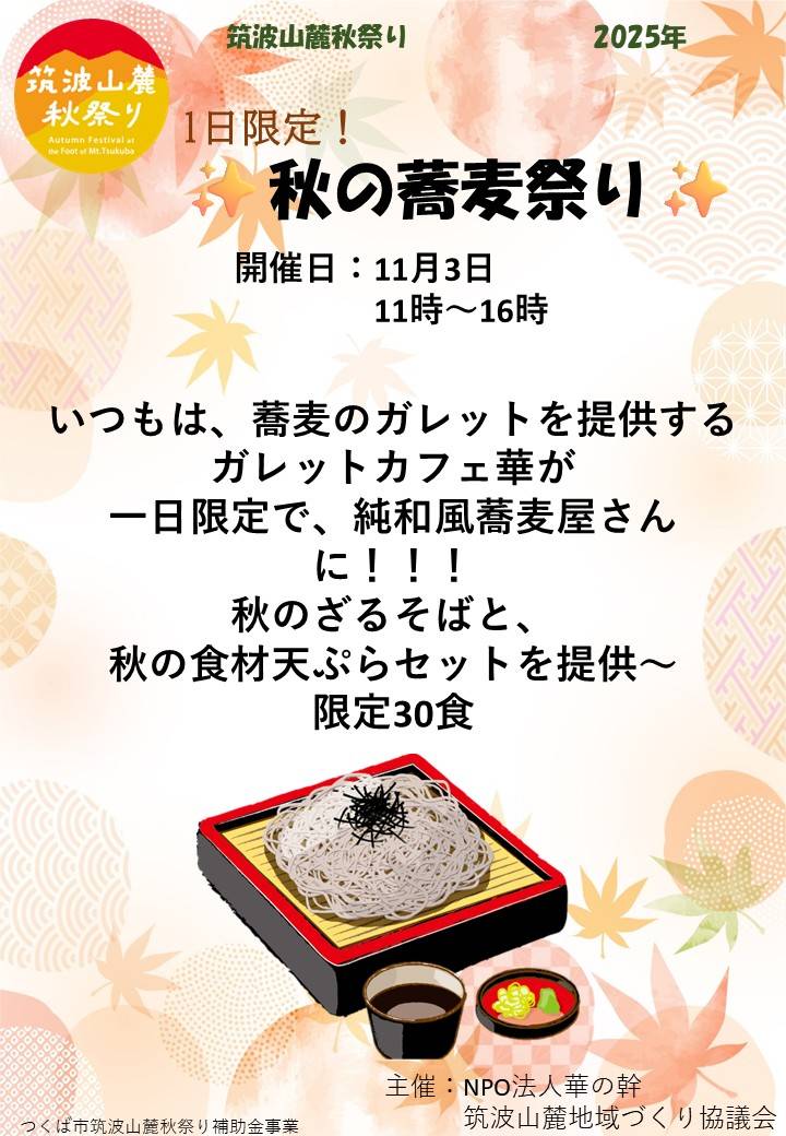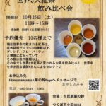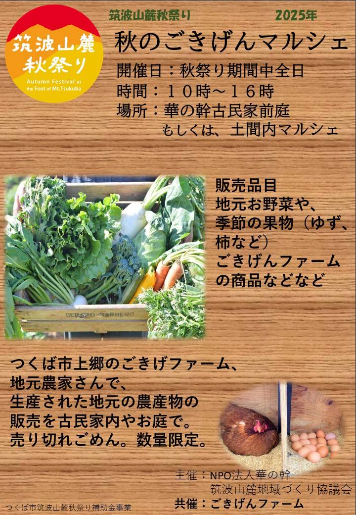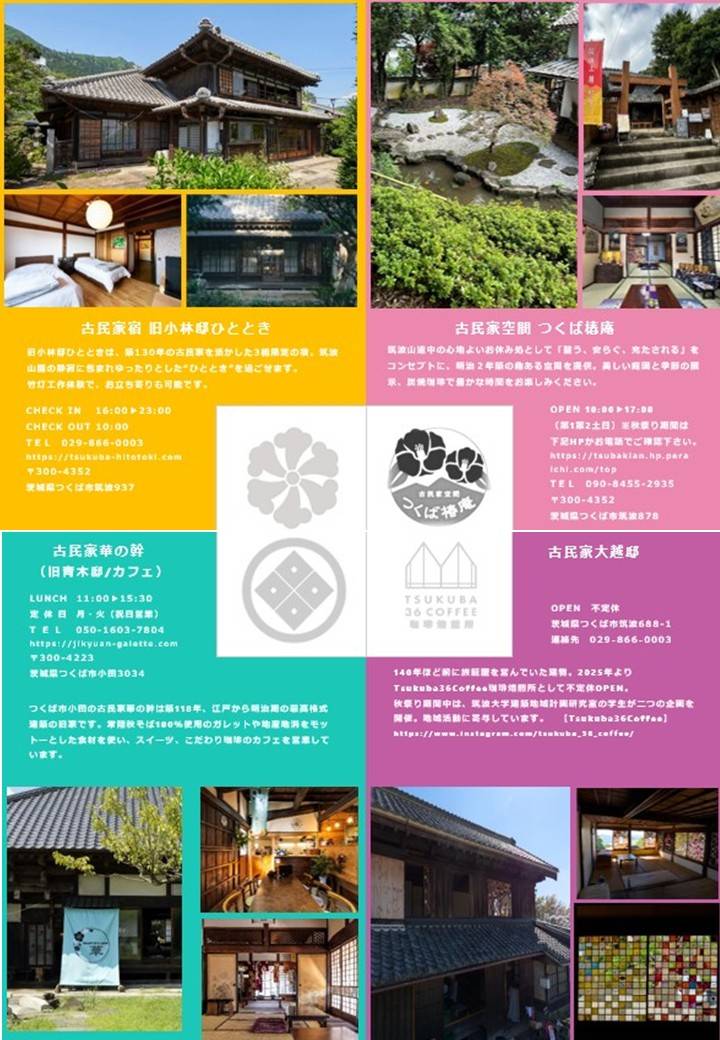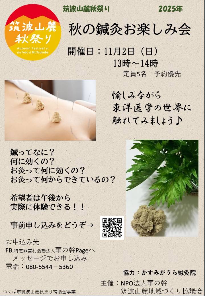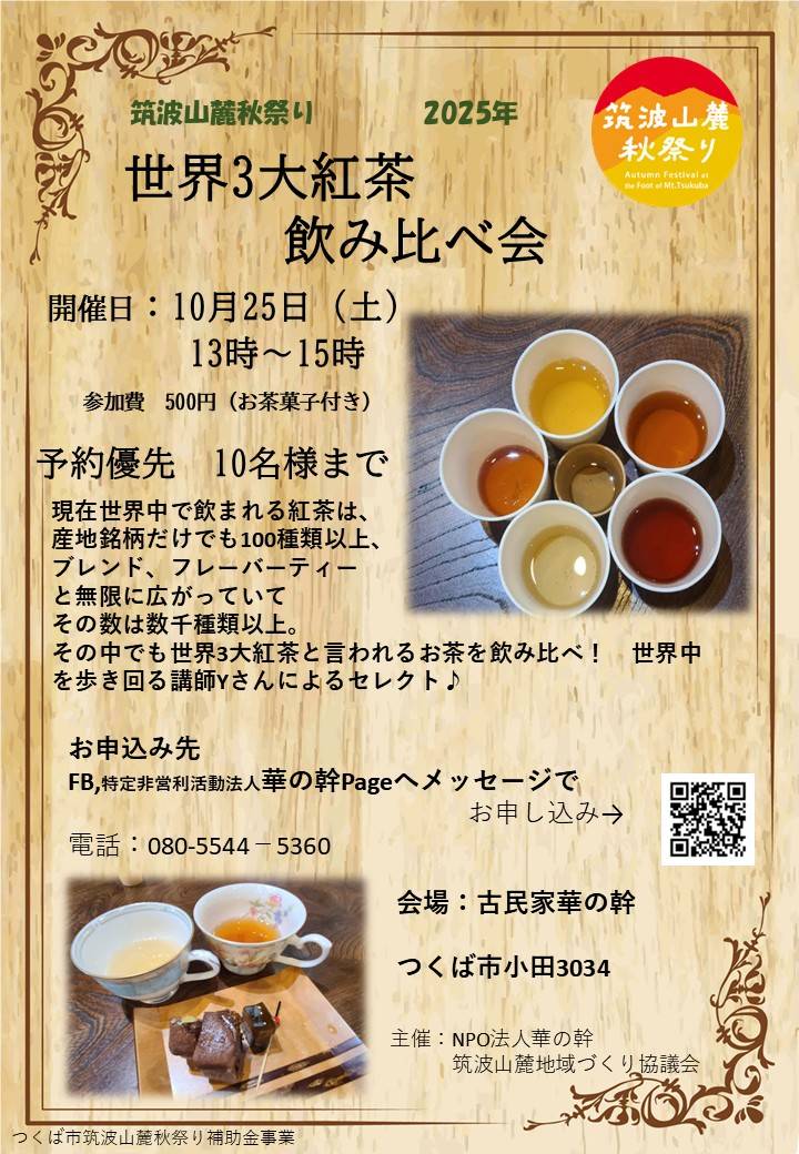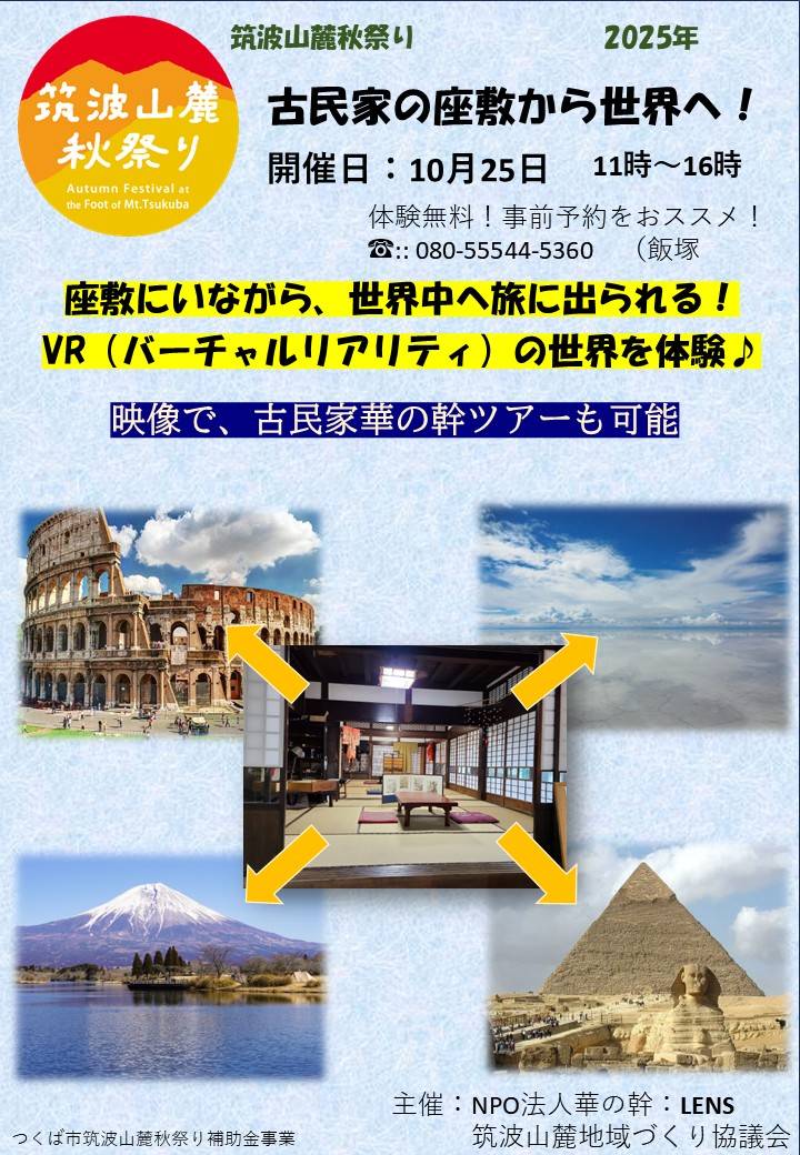 ほ秋のごきげんマルシェ <食>Autumn Gokigen Marche2025.10.25 土 26 日 11.1 土 2 日 3 月 10:00~16:00筑波山麓の地元のお野菜や農産物を直売!協力:ごきげんファーム (有料)主催/NPO法人華の幹古民家座敷でVRツアー! <体験>VR tour in an old house2025.10.25 土 10:00~16:00古民家の座敷からVRを使って行きたいところへトリップ!古民家ツアーのVR体験も!協力:LENS (無料)主催/NPO法人華の幹世界3大お茶飲み比べ会 <食>Three Major Tea Tasting2025.10.25 土 13:00~14:00世界三大紅茶の飲み比べ!さらに原初と同じ作り方の正山小種を試飲! (無料)主催/NPO法人華の幹秋の演奏会 <鑑賞>Old House Concert2025.11.2 日 10:00~16:00古民家の座敷でゆったりのんびり演奏会 (無料)主催/NPO法人華の幹