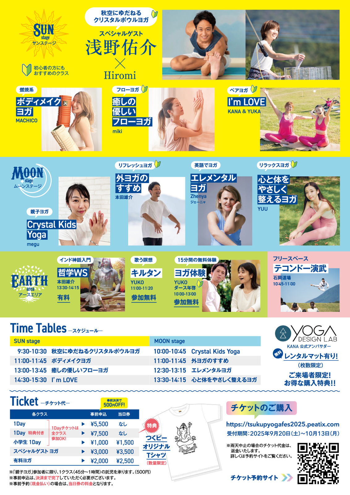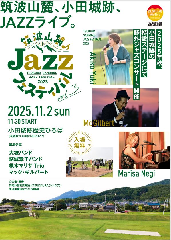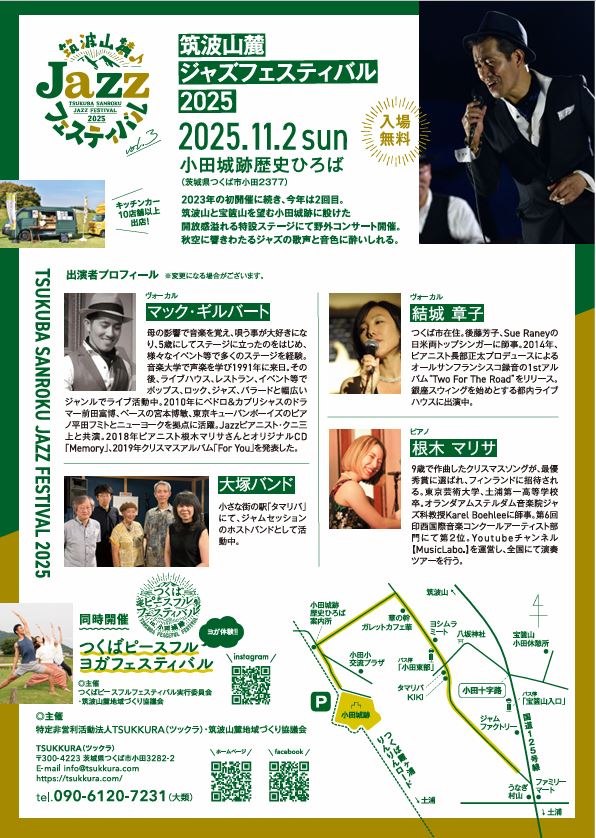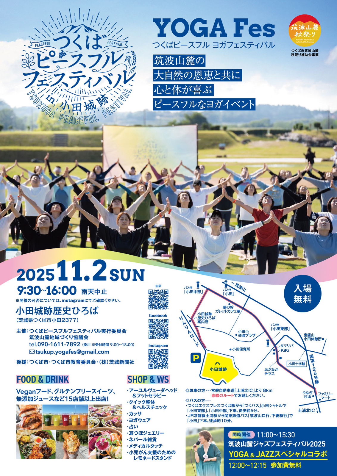ふ筑波山麓ジャズフェスティバル2025 <食・鑑賞>Outdoor Jazz Festival2025.11.2 日 11:00~16:00筑波山、宝篋山を眺めながら聴く本格JAZZライブ。小雨決行 (無料)主催/NPO法人TSUKKURAつくばピースフルヨガフェスティバル2025 <体験・食>Peaceful Yoga Festival outdoors2025.11.2 日 9:30~16:00自然の中でのヨガイベント!浅野佑介氏のヨガ/大人も子供も楽しめるヨガ/無料体験あり 雨天中止 (入場無料、有料企画あり)主催/つくばピースフルフェスティバル実行委員会つくばブルーベリー染め物体験 <体験>Blueberry Dyeing Experience2025.11.2 日 10:00〜16:00 (※材料なくなり次第終了)つくばの特産品であるブルーベリーの廃棄品を利用し、小田中テラスで使用する座布団カバーを作成するための布染めを計画します。予約不要・定員なし。 (300円)主催/法政大学 赤松研究室